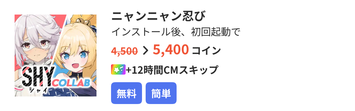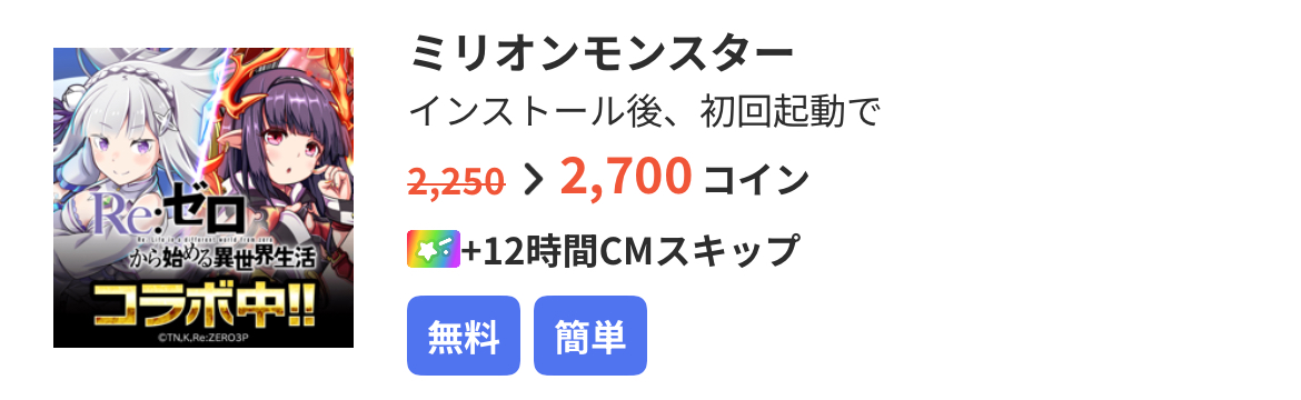 このような案件が複数用意されているため、33000コイン溜まるまでアプリインストールを繰り返すだけで、300円以上CLEARです!